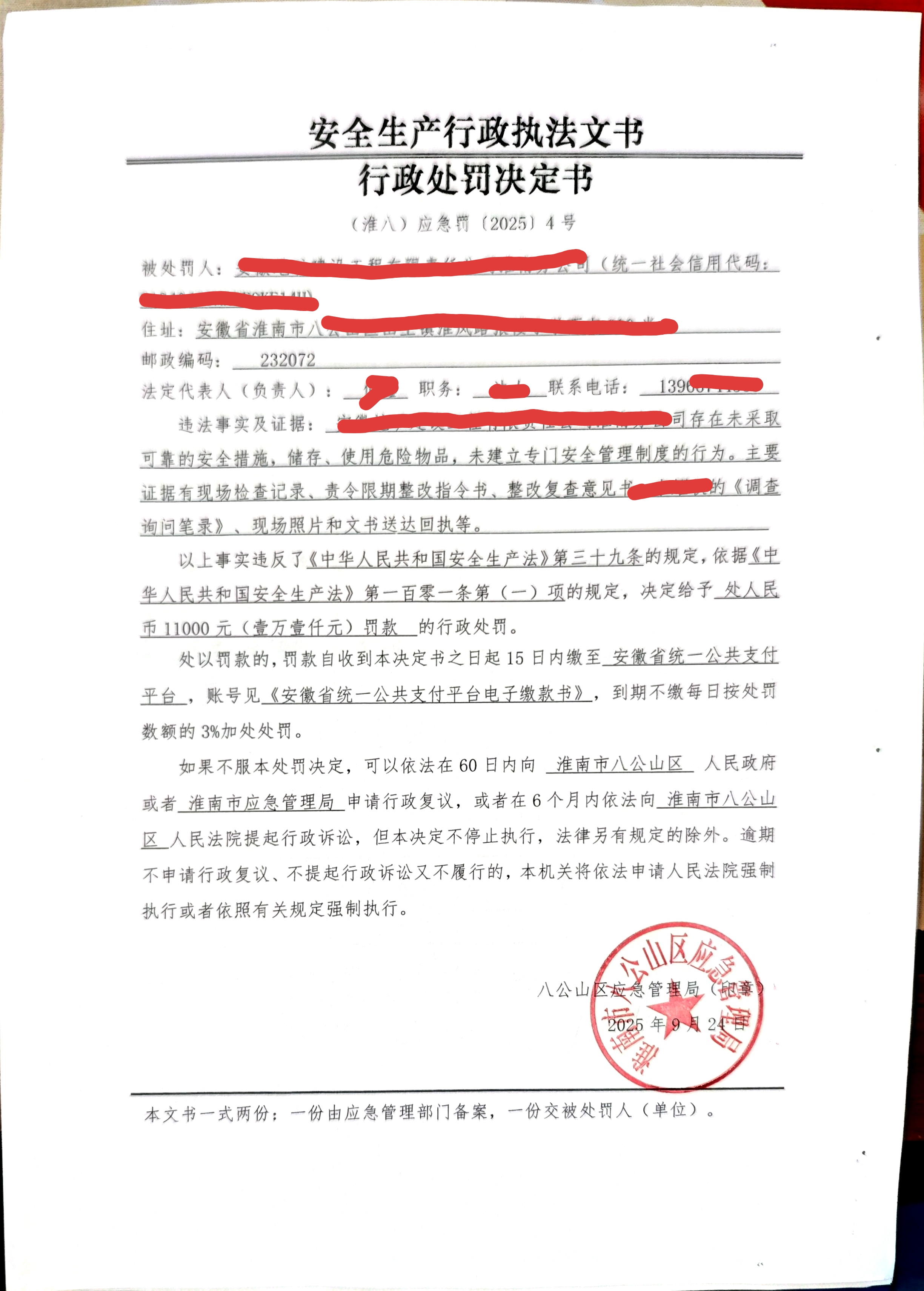 行政处罚决定书(个人)(淮八)应急罚〔2025〕4号