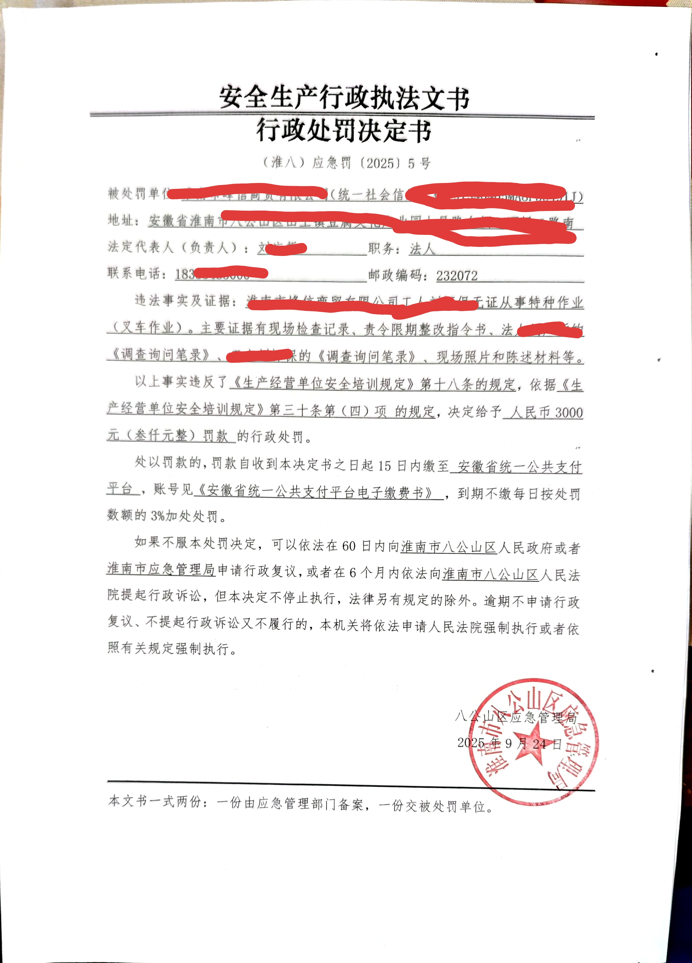 行政处罚决定书(个人)(淮八)应急罚〔2025〕5号