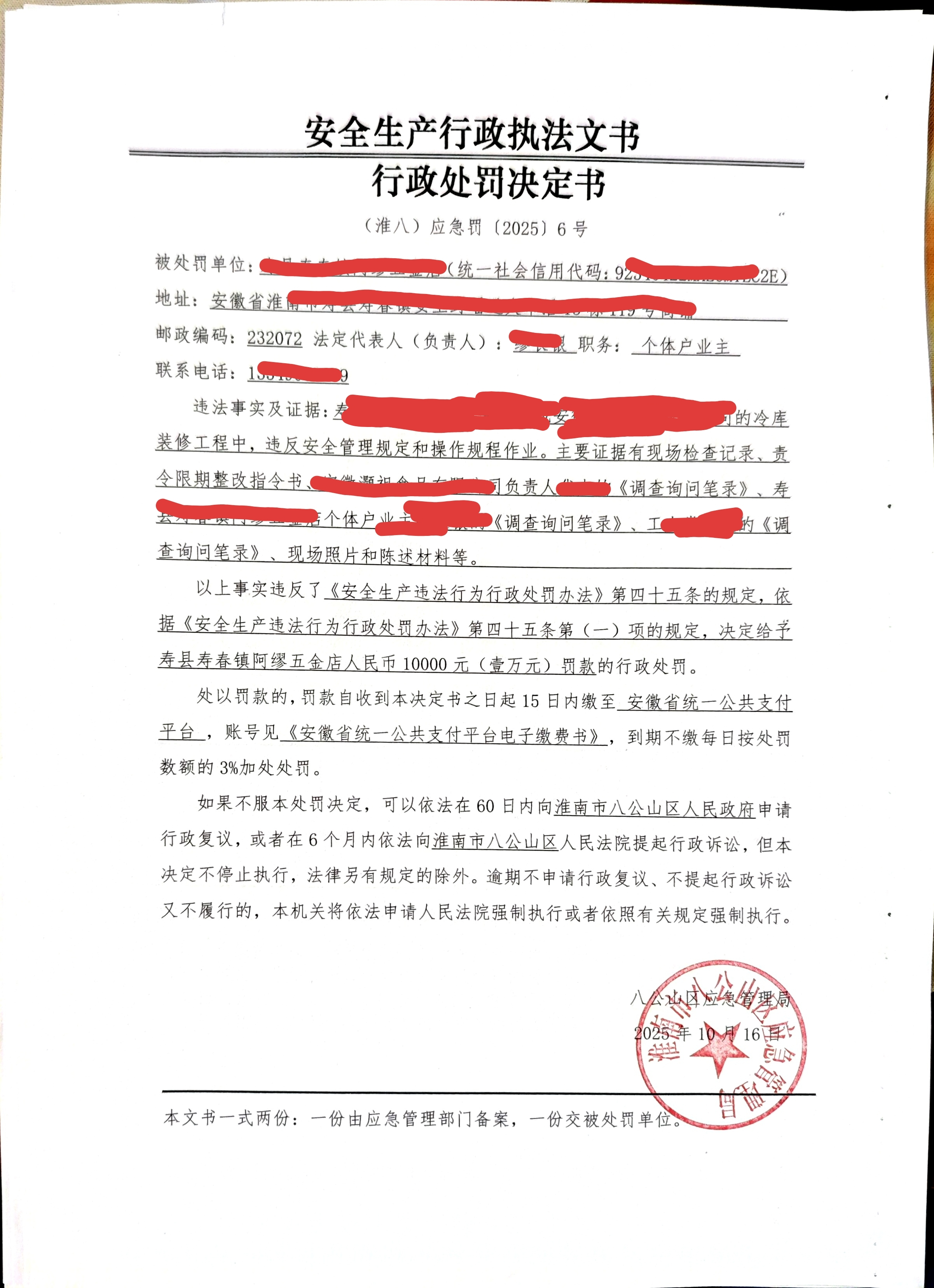 行政处罚决定书(个人)(淮八)应急罚〔2025〕6号