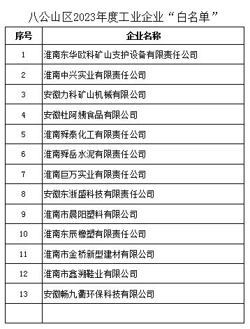 根据《关于印发金融支持“亩均论英雄”改革若干举措的通知》(皖经信运行〔2023〕53号),按照《关于印发<八公山区工业企业“白名单”管理办法(试行)><八公山区商贸企业“白名单”管理办法(试行)>的通知》(淮八府〔2024〕3号),区亩均办根据2022年度规上工业企业亩均效益评价结果,经区人民政府常务会议讨论通过,拟认定八公山区2023年度工业企业“白名单”(见附件),现将13家企业名单予以公示。公示期为5个工作日(2024年2月5日至2024年2月9日)。如有意见和建议,请在公示期内反馈至区亩均办。
