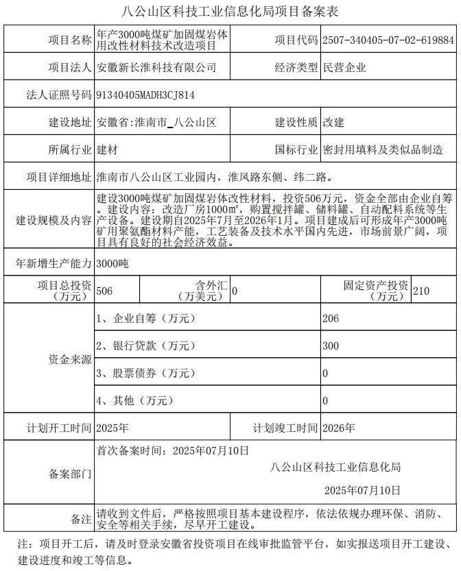 年产3000吨煤矿加固煤岩体用改性材料技术改造项目