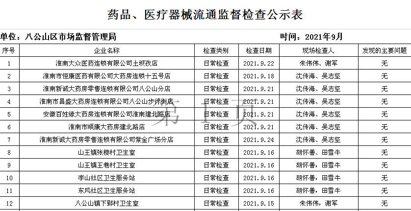八公山区市场监督管理局2021年8月药品、医疗器械监督检查情况公示