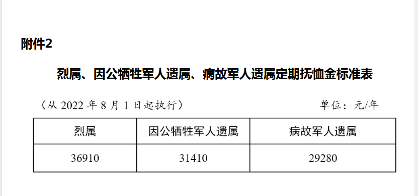 2023年烈属、因公牺牲军人遗属、病故军人遗属定期抚恤金标准表