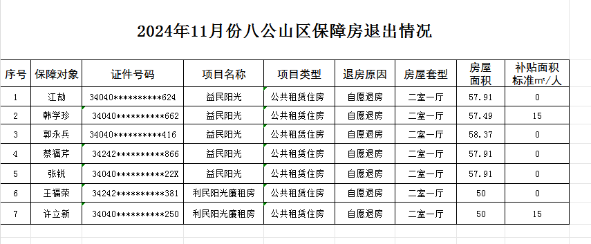 2024年11月份八公山区保障房退出情况(含山王镇)