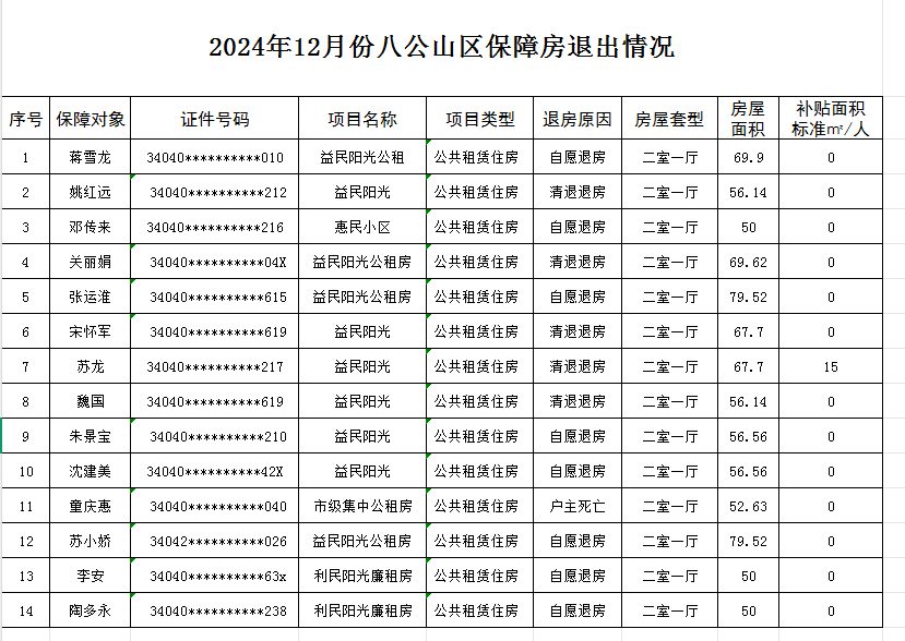2024年12月份八公山区保障房退出情况(含山王镇)