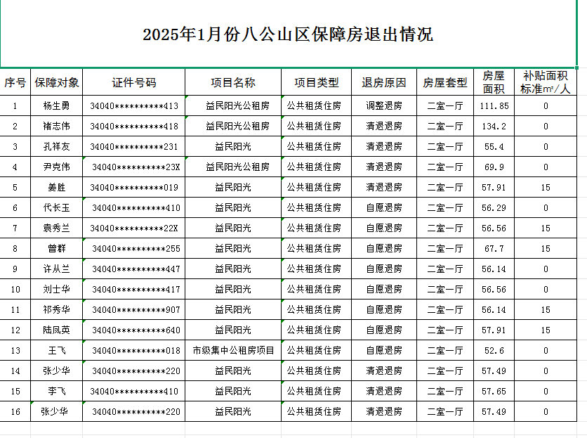 2025年1月份八公山区保障房退出情况(含山王镇)