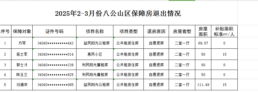 2025年2-3月份八公山区保障房退出情况(含山王镇)