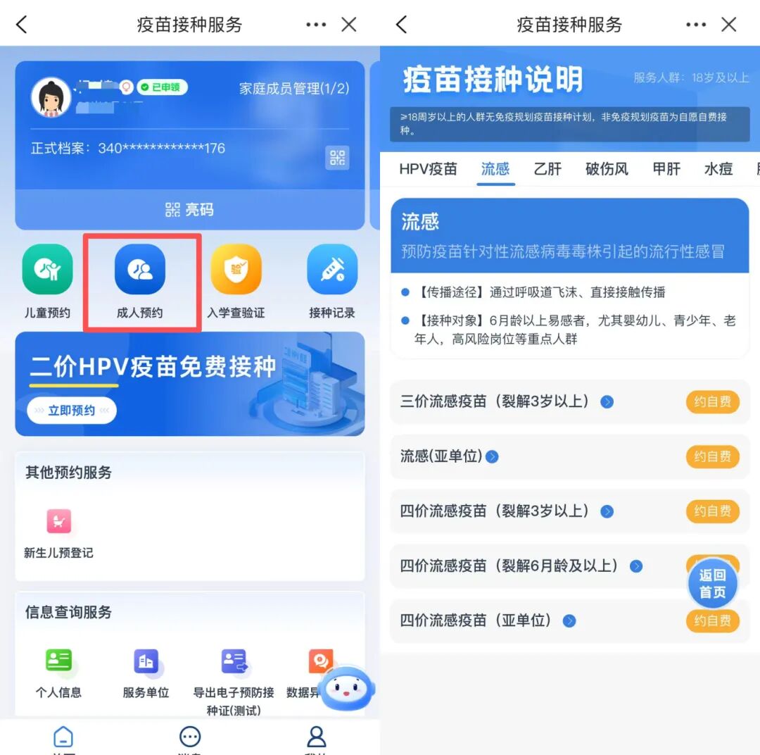 以成人预约为例,点击进入即可预约相关流感疫苗。