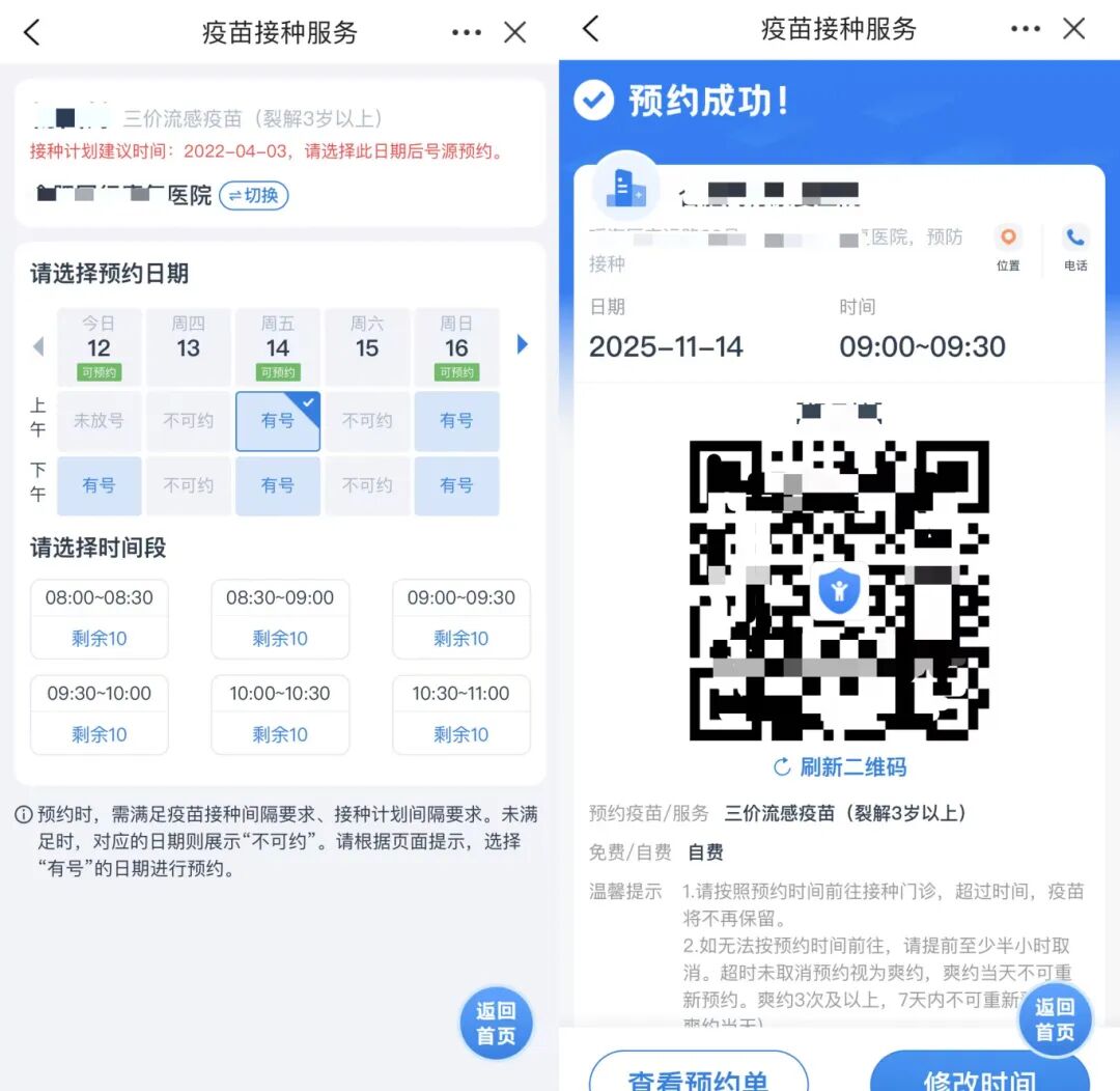如点击三价流感疫苗,阅读接种需知后,选择可预约的医院,预约成功后可根据预约码,到指定地点接种疫苗。