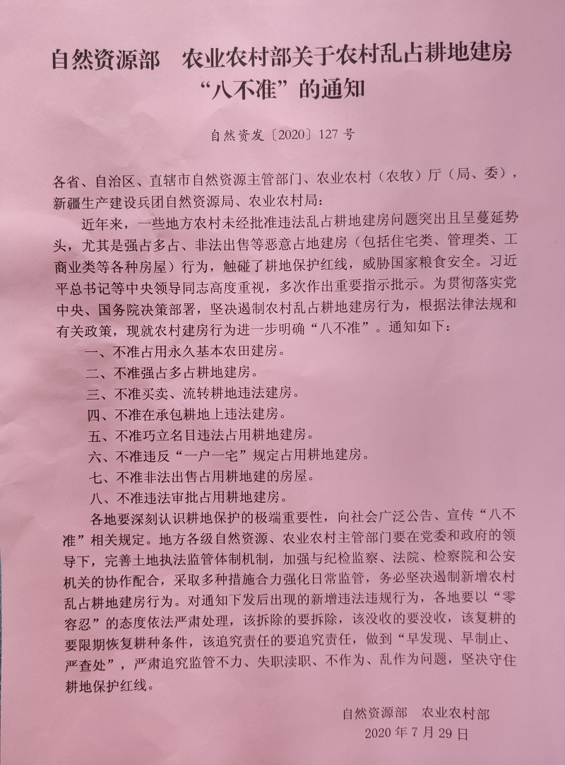 自然资源部农业农村部关于农村乱占耕地建房“八不准”的通知