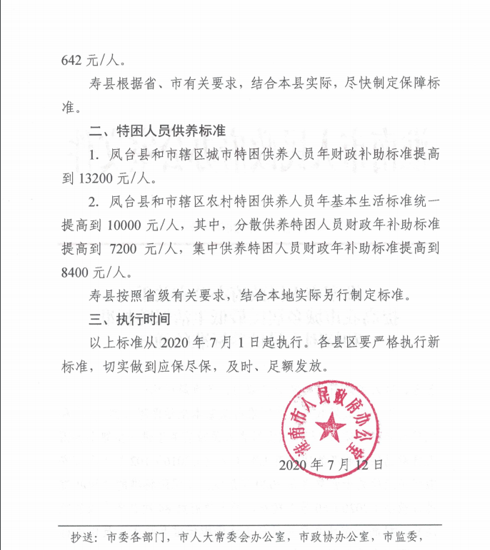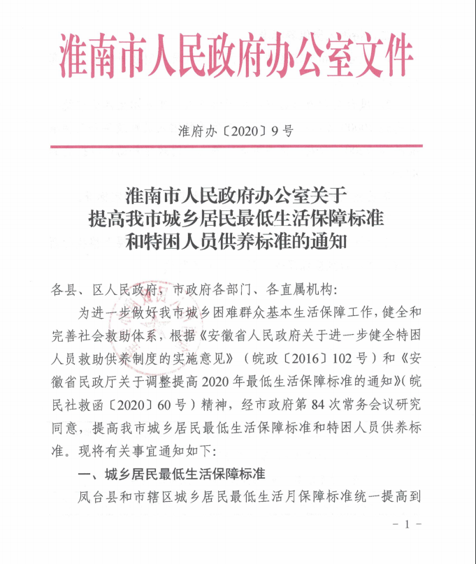 【政策与标准】关于执行《淮南市人民政府办公室关于提高我市城乡居民最低生活保障标准和特困人员供养标准的通知》