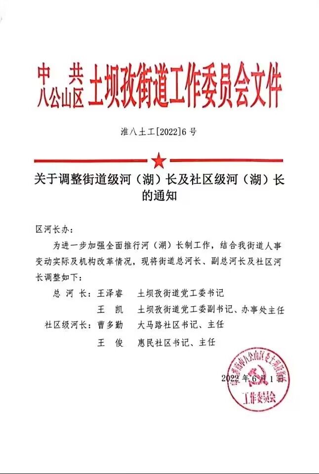 关于调整街道级河(湖)长及社区级河(湖)长的通知