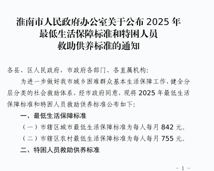 | 名称: | 淮南市人民政府办公室关于公布2025年最低生活保障标准和特困人员救助供养标准的通知 |