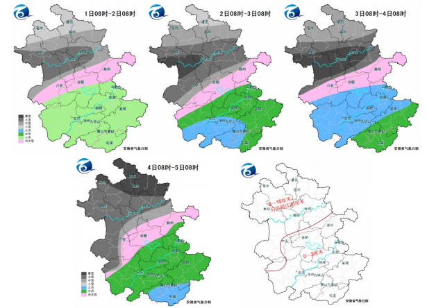 根据淮南市气象台最新天气预报,2月1-4日我市将出现持续雨雪天气。其中,1日雨夹雪转雪,3日降雪强度将增强,1-4日最大积雪深度8~15厘米,局部超过20厘米。