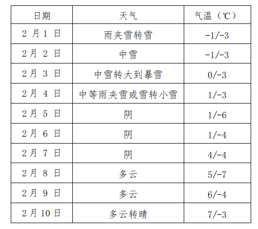 降水:预计2月1-4日我市有持续雨雪天气,其中1日雨夹雪转雪并可能伴有冻雨,3日降雪强度将增强。1-4日最大积雪深度8~15厘米,局部超过20厘米。5-7日阴,8日后以多云天气为主。