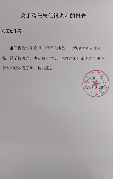 八公山区第一中学关于聘任学校退休物理教师朱仕银老师的报告