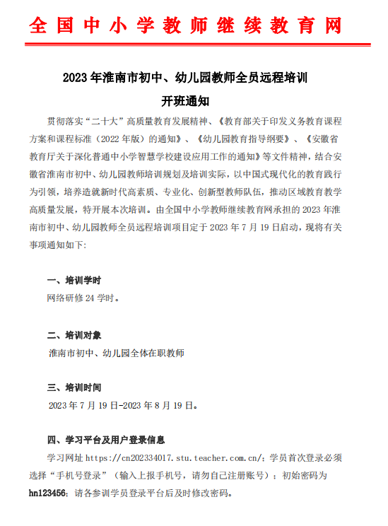 2023年淮南市初中、幼儿园教师全员远程培训开班通知