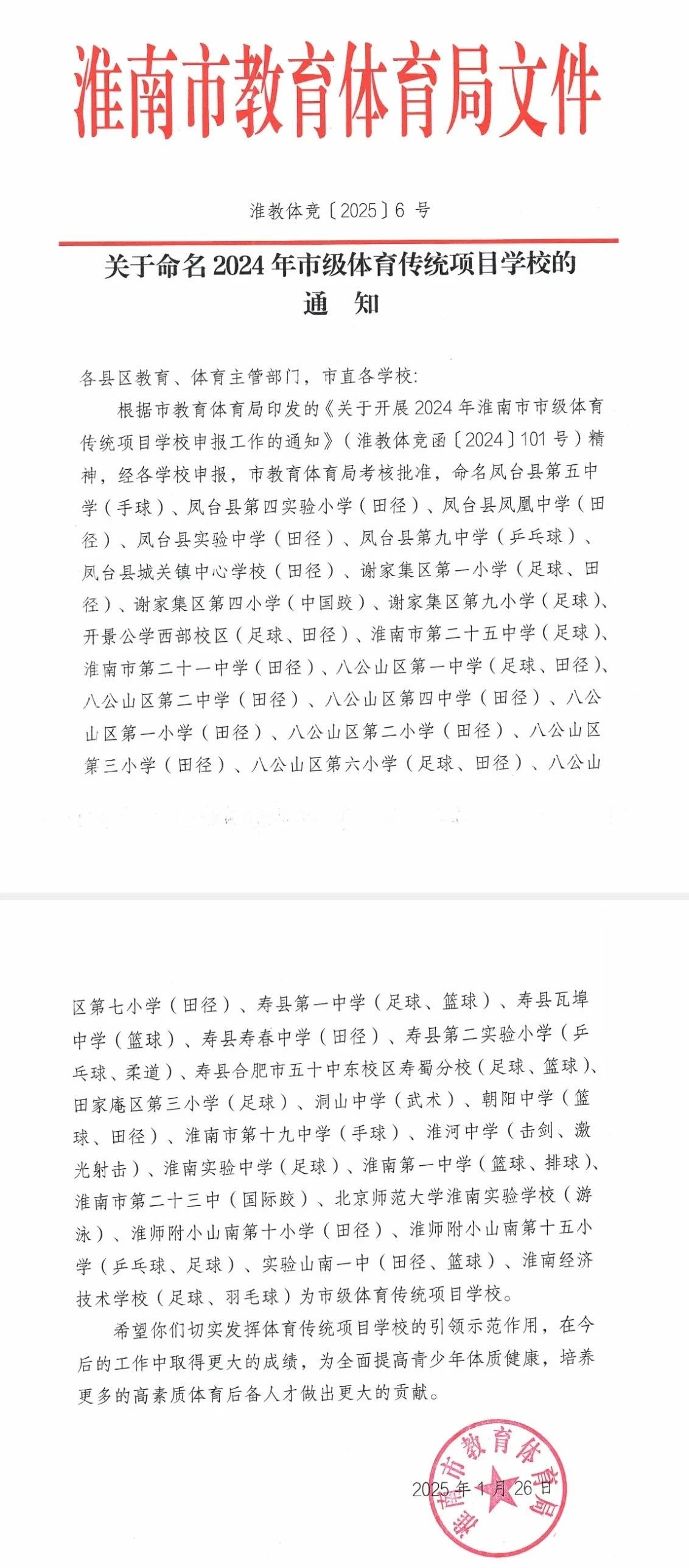 近日,淮南市教育体育局印发了《关于命名2024年市级体育传统项目学校的通知》,八公山区第一中学足球、田径两个项目顺利通过验收,荣获“淮南市体育传统项目学校”称号。 近年来,八公山区第一中学始终坚持以习近平新时代中国特色社会主义思想为指导,全面贯彻落实党的教育方针,努力践行“为生命而教育”的办学理念,积极推进体教融合领域的创新实践,为孩子们的终身发展和健康成长奠定了良好的基础。
