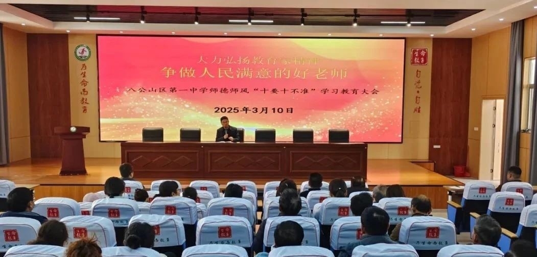 教师是立教之本、兴教之源。为大力弘扬教育家精神,积极践行《新时代中小学教师职业行为十项准则》,打造一支“博雅立己、养正立人、奉献立功”的高素质专业化教师队伍,3月10日,八公山区第一中学在校报告厅举行师德师风“十要十不准”学习教育大会。会议由党支部书记、校长张敬卓主持,全体教职工参加。