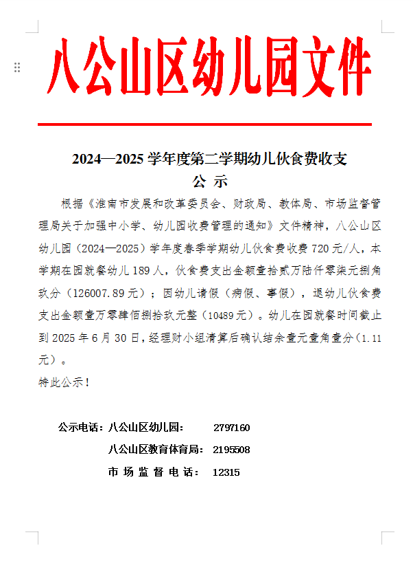 2024—2025学年度第二学期幼儿伙食费收支公示