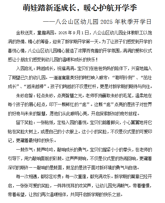 萌娃踏新逐成长,暖心护航开学季——八公山区幼儿园2025年秋季开学日