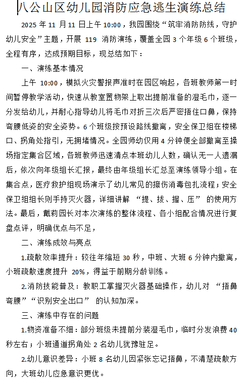 2025.11.11八公山区幼儿园消防应急逃生演练总结