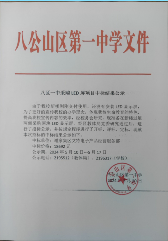 八区一中采购LED屏项目中标结果公示