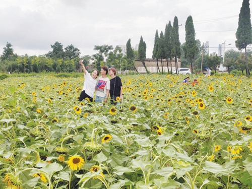 游客在向日葵花海里拍照留念 本报通讯员 王品 摄