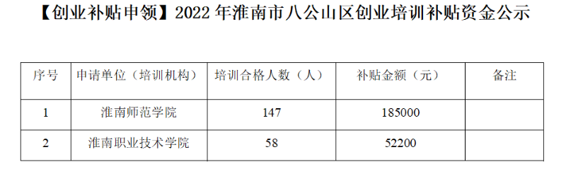 2022年淮南市八公山区创业培训补贴资金公示